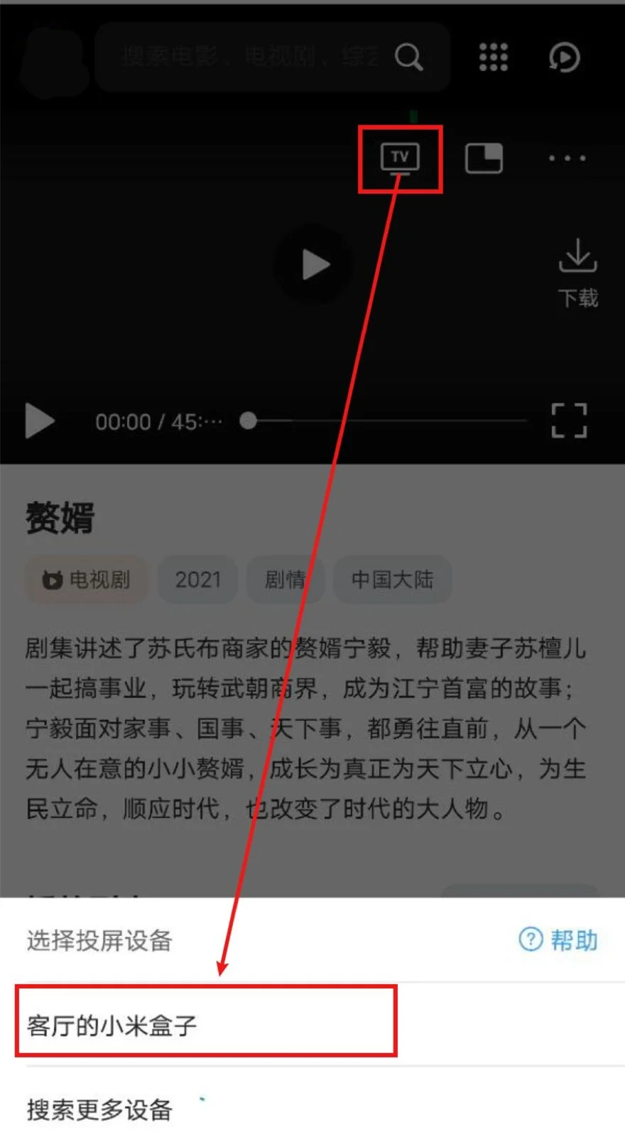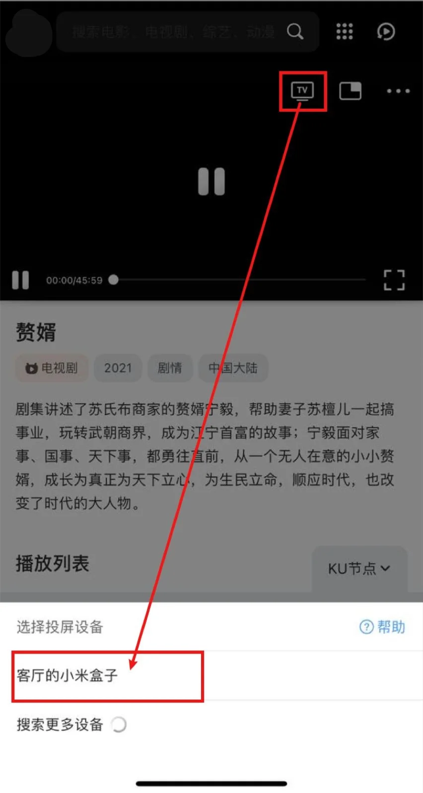 打开QQ浏览器(会接管网页播放器)->打开一个视频网盘->播放视频->选中投屏图标->等待搜寻出智能电视/电视盒子->选中,即可投屏。